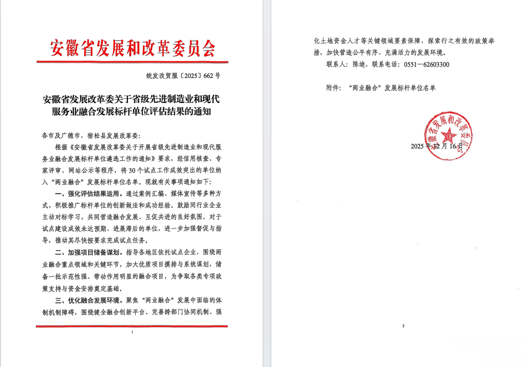 近日,安徽省發改委、安徽省工信廳分別公布《關于省級先進制造業和現代服務業融合發展標桿單位評估結果的通知》《關于公布2025年度服務型制造標桿企業和制造服務一體化應用場景名單的通知》,合力成功入選安徽省“兩業融合”發展標桿單位和服務型制造標桿企業。...
