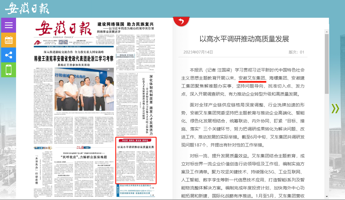 7月14日,《安徽日報》在頭版中就安徽叉車集團(tuán)以高水平調(diào)研推動高質(zhì)量發(fā)展情況進(jìn)行了報道。報道中表示,學(xué)習(xí)貫徹習(xí)近平新時代中國特色社會主義思想主題教育開展以來,安徽叉車集團(tuán)聚焦解難題辦實事,堅持問題導(dǎo)向,找準(zhǔn)切入點、發(fā)力點,深入開展調(diào)查研究,有力...